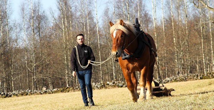 Oskar Hässelmo tillsammans med Charmör, som efter en stund vande sig med känslan av att dra en stock istället för vagn. Foto: Diana Larsson
