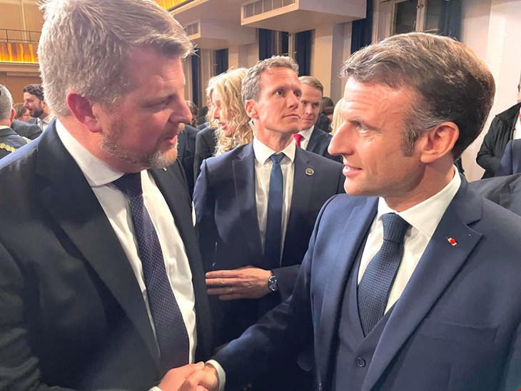 Hans Ramel träffade Frankrikes president Emmanuel Macron i AF-borgen i Lund under hans statsbesök i Sverige. Foto: Pressbild